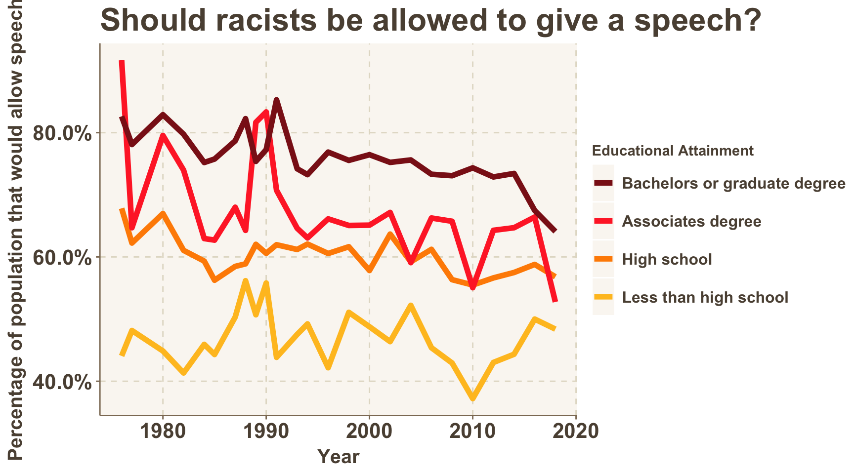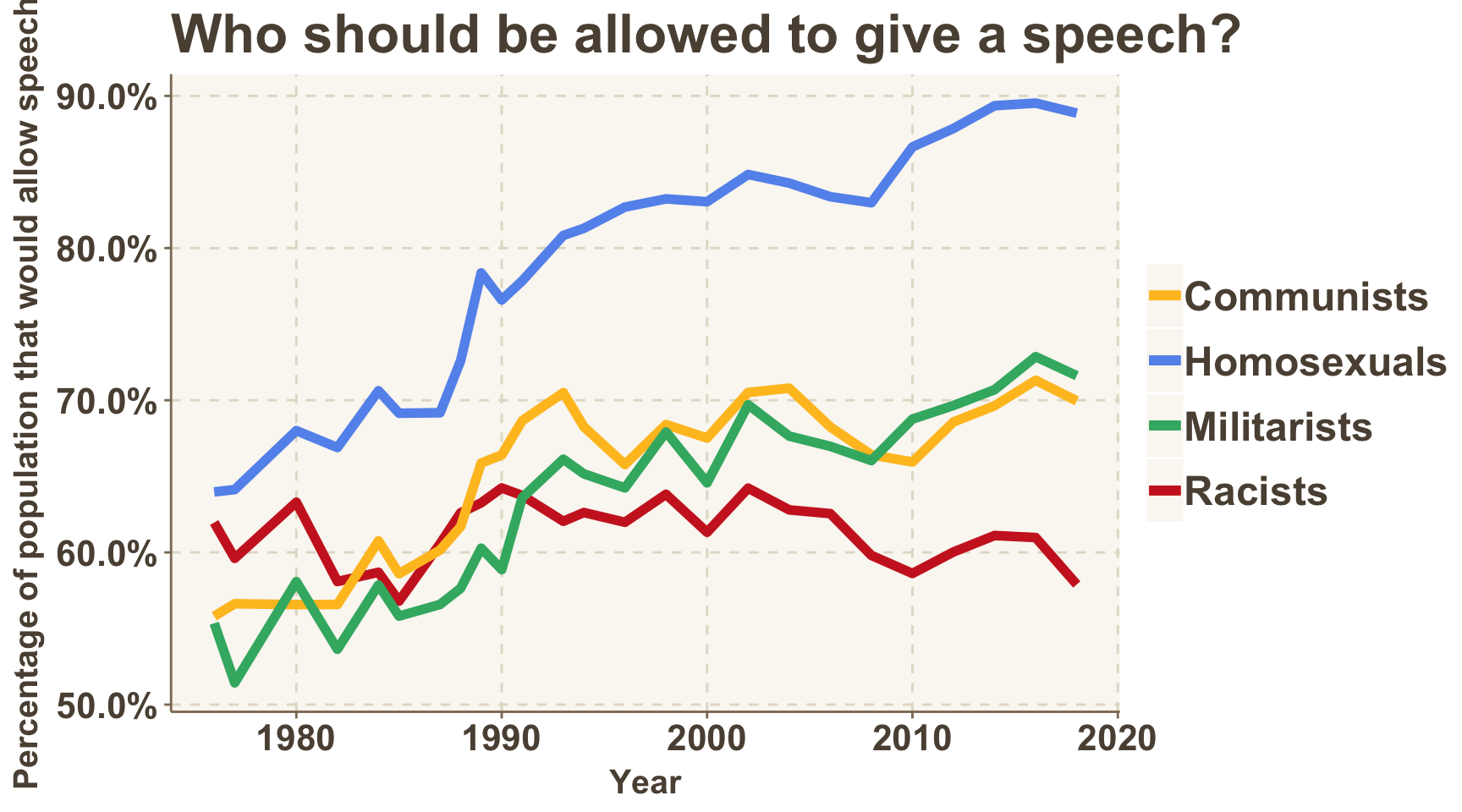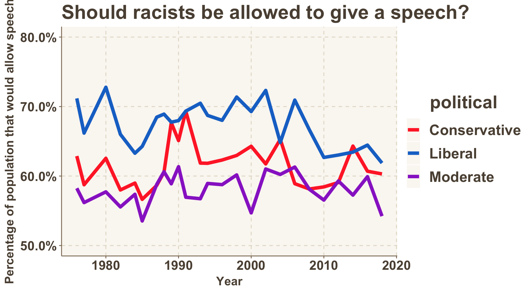 The percentage of survey respondents in favor of allowing different types of speakers appear to be as high as ever. There is a key exception: speakers who are considered racist.