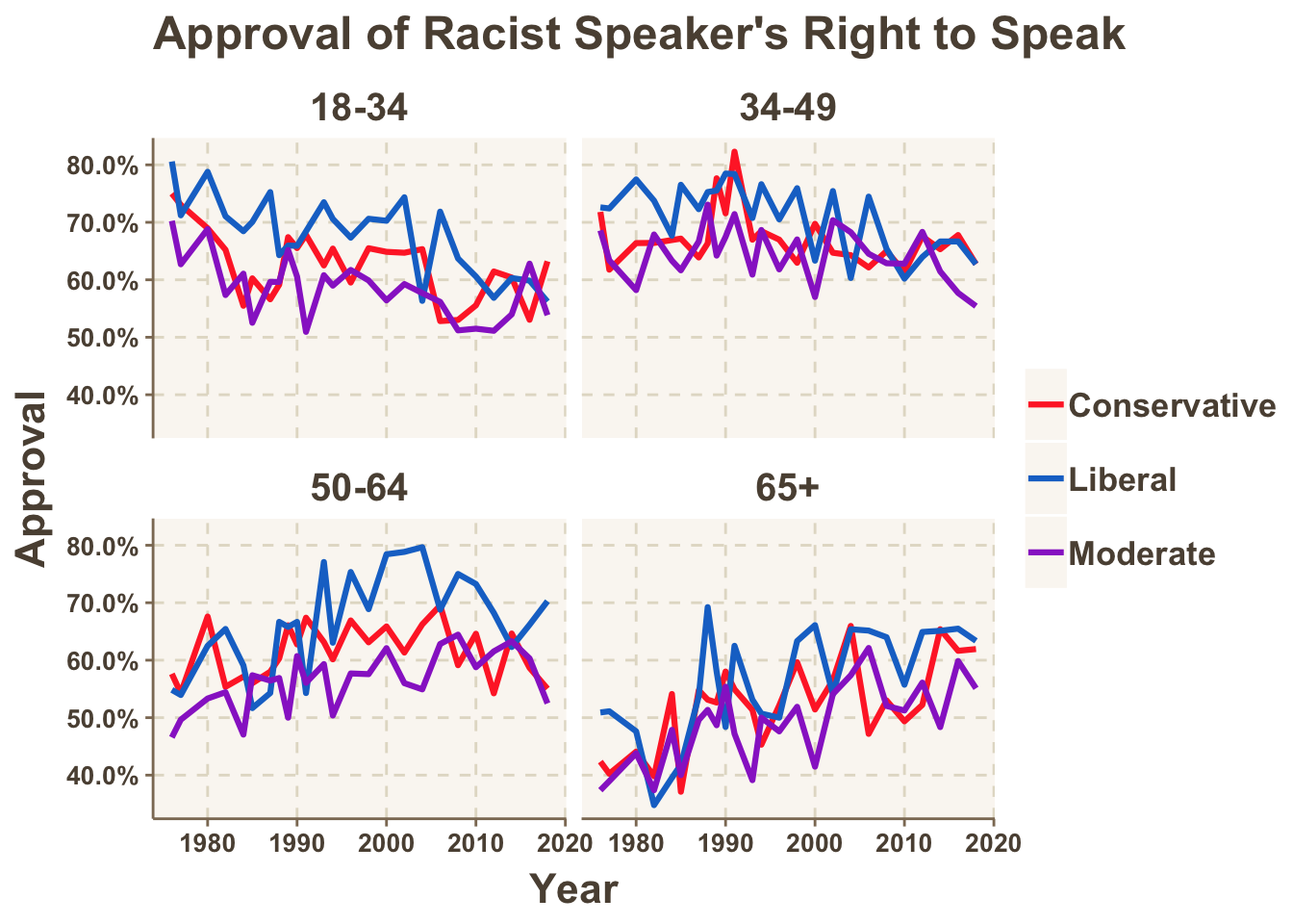 The following graphs show the approval rate for racist speakers broken down by age group and political party. We see little discernible difference in approval rates of racist speakers between liberals and conservatives within age groups.