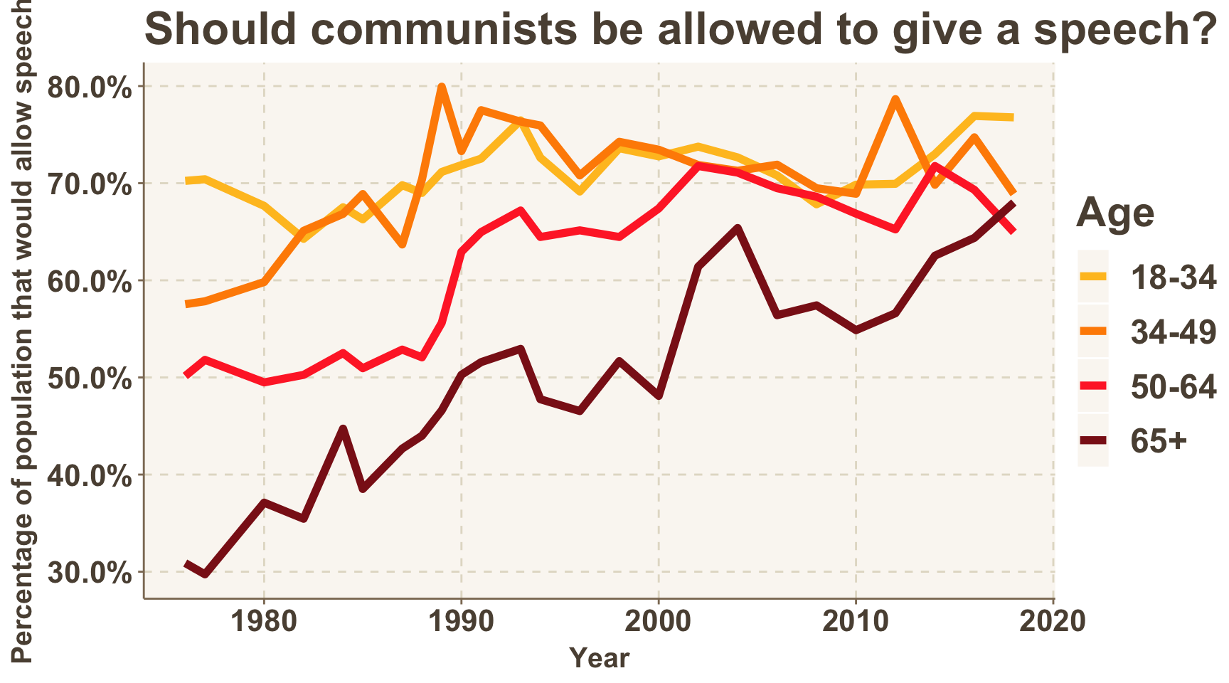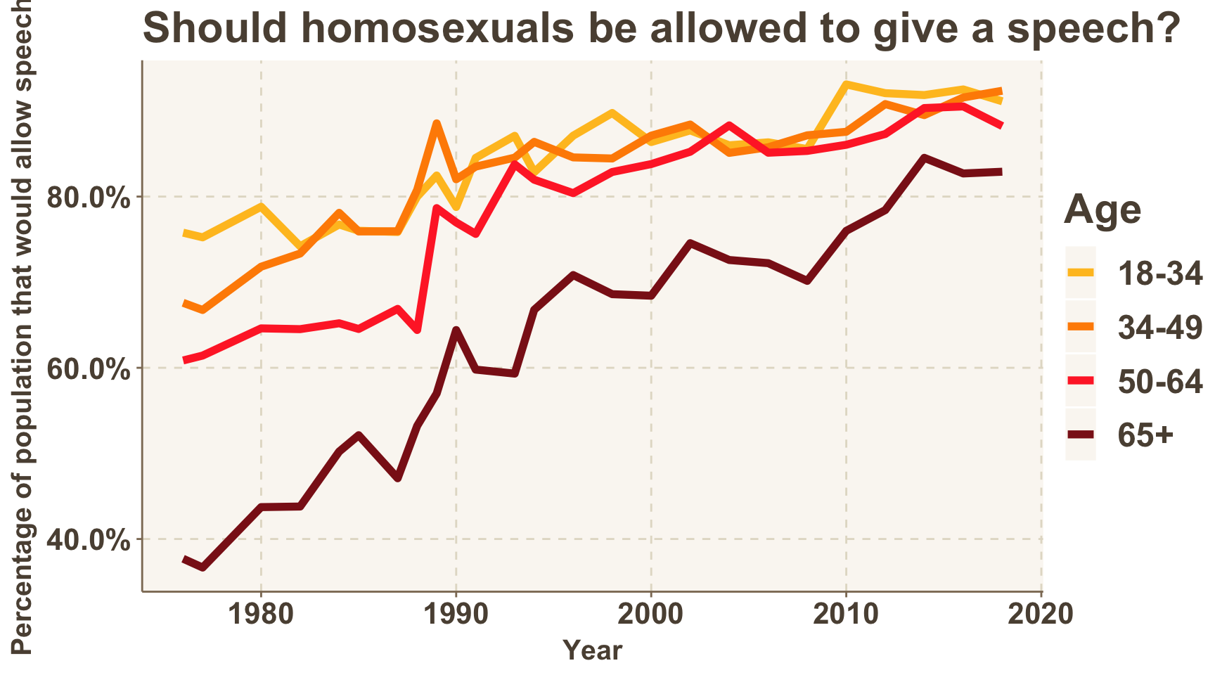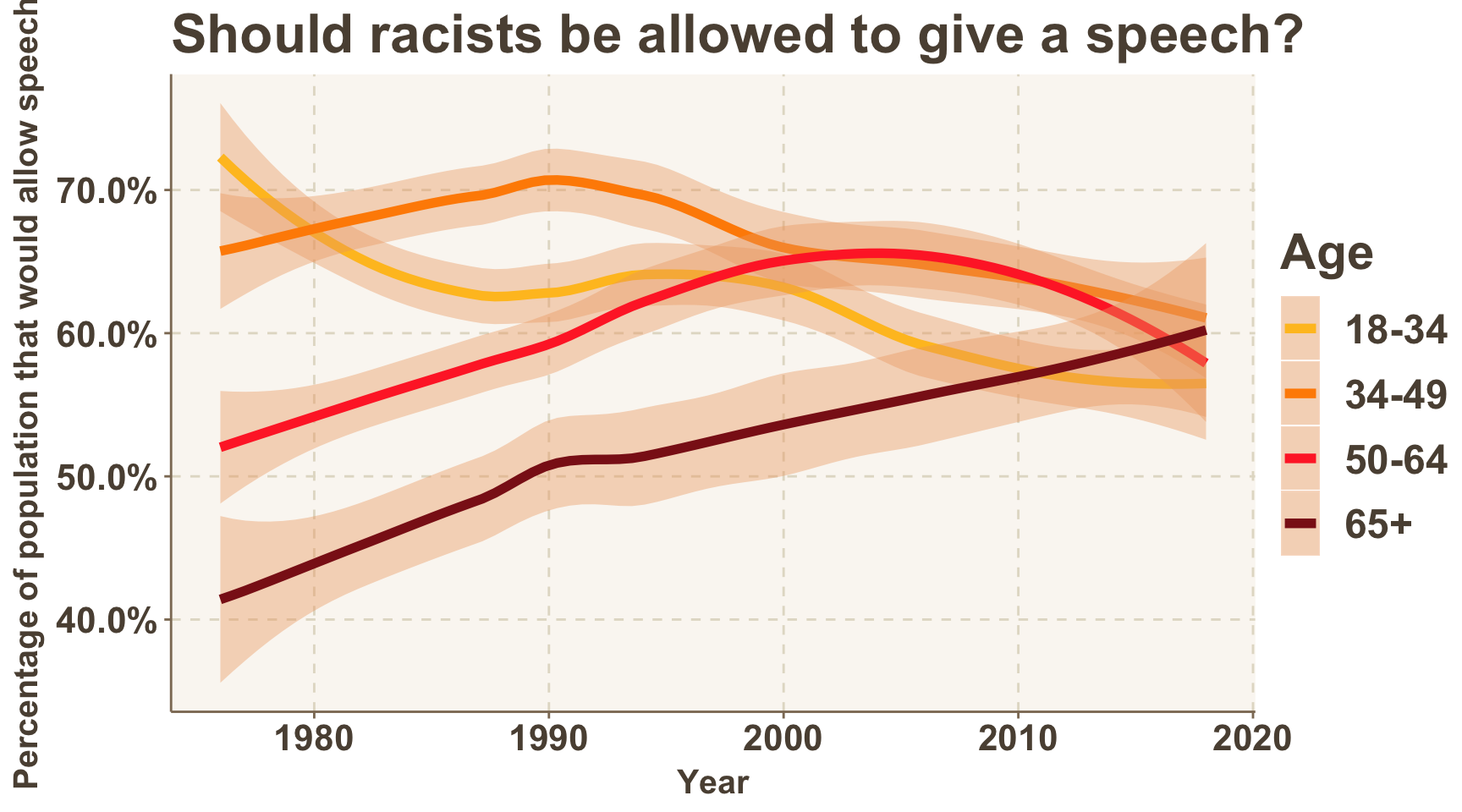 There are some differences among age groups. Below, we see that while the 50-64 and 65+ age groups have both grown more open to allowing people with racist views to speak over time, the opposite is true for the 18-34 and 34-49 age groups. To many this will be unsurprising. Newspapers are filled with stories of intolerant, young protesters on college campuses who are not open to hearing certain views.
