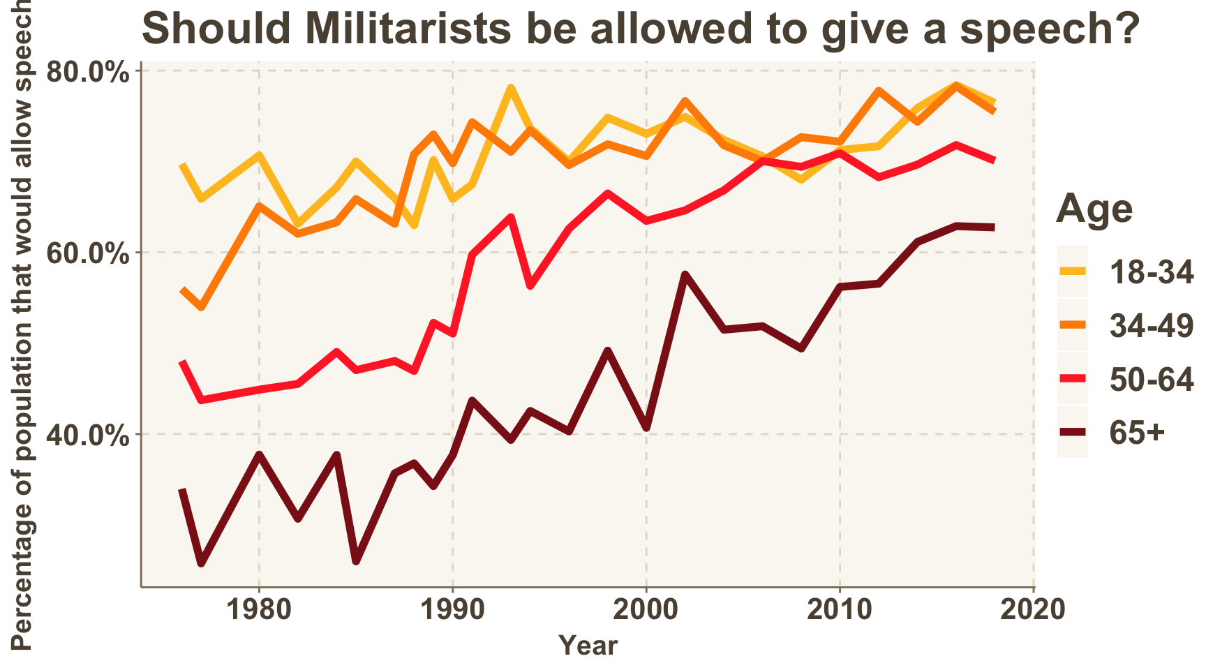 The graphs below, however, begin to tell a very different story. The percentage of people in each age group willing to allow homosexuals, communists, and militarists to speak has been steadily increasing over time. The only exception to this pattern of increasing levels of tolerance for speakers is for the category of racist speakers. In this category, the two older age brackets still abide by the trend of increasing allowance of speakers, but, the two younger age brackets have begun to deviate from the normal trend.
