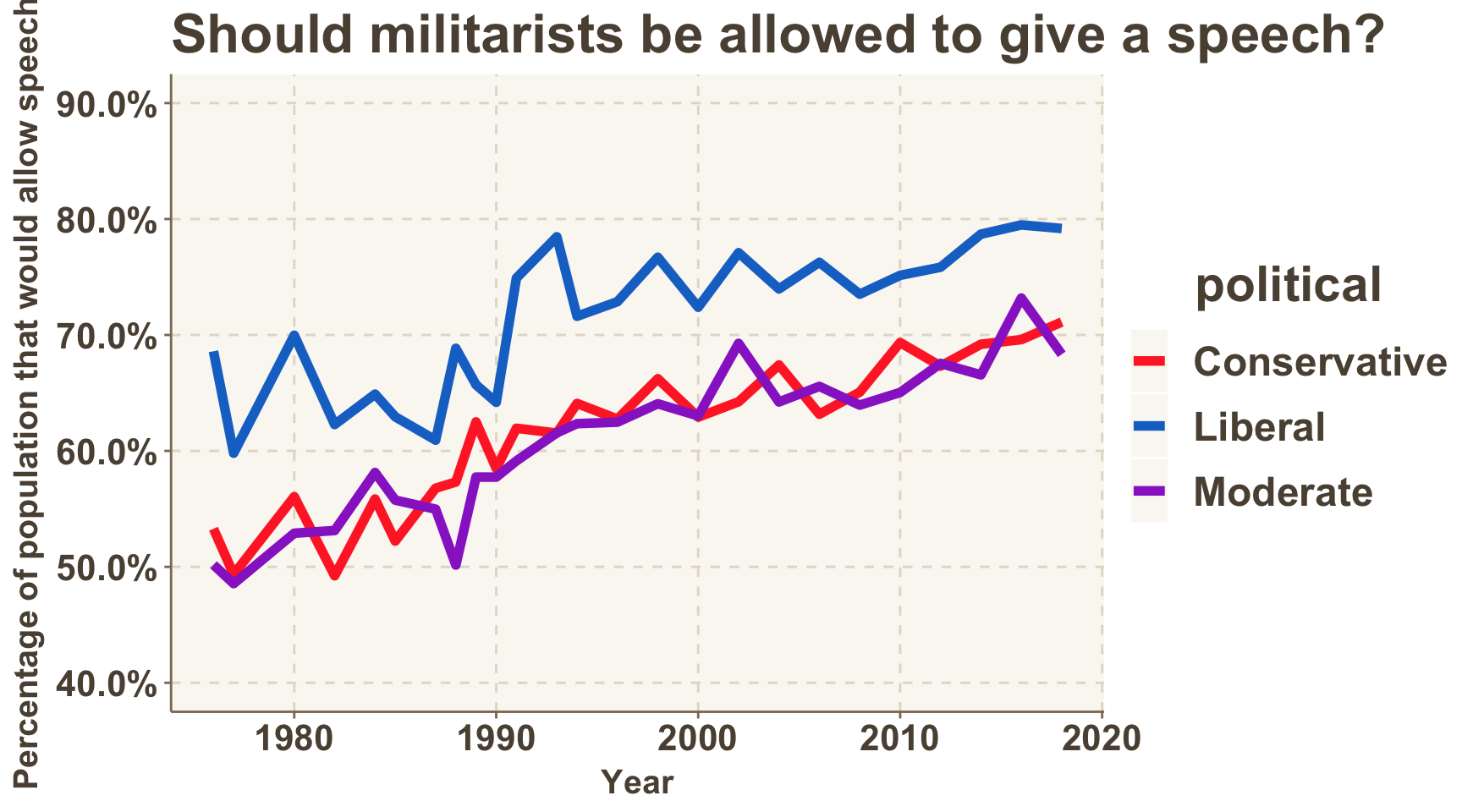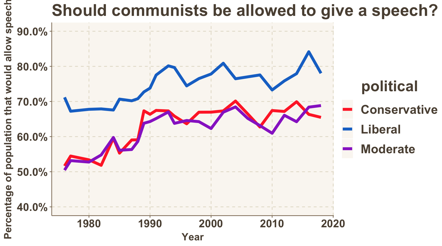 The graphs below tell a very different story. Self-identified liberals, in all areas, tended to have the highest rates of support for speakers of any kind.